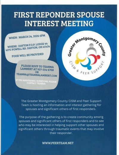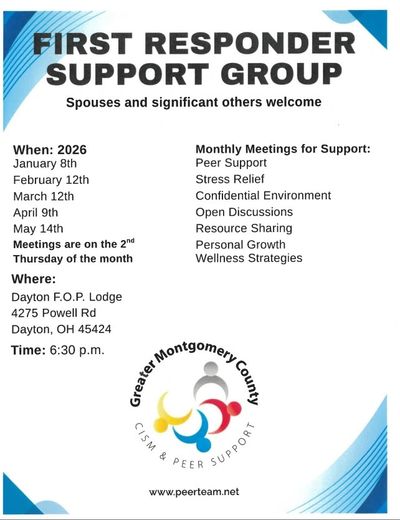 The Greater Montgomery County Critical Incident Stress Management and Peer Support Team is guided by a mental health clinician and made up of first responders, both active and retired, from multiple agencies throughout the Miami Valley. The team is also bolstered by chaplains associated with the agencies of first responders.